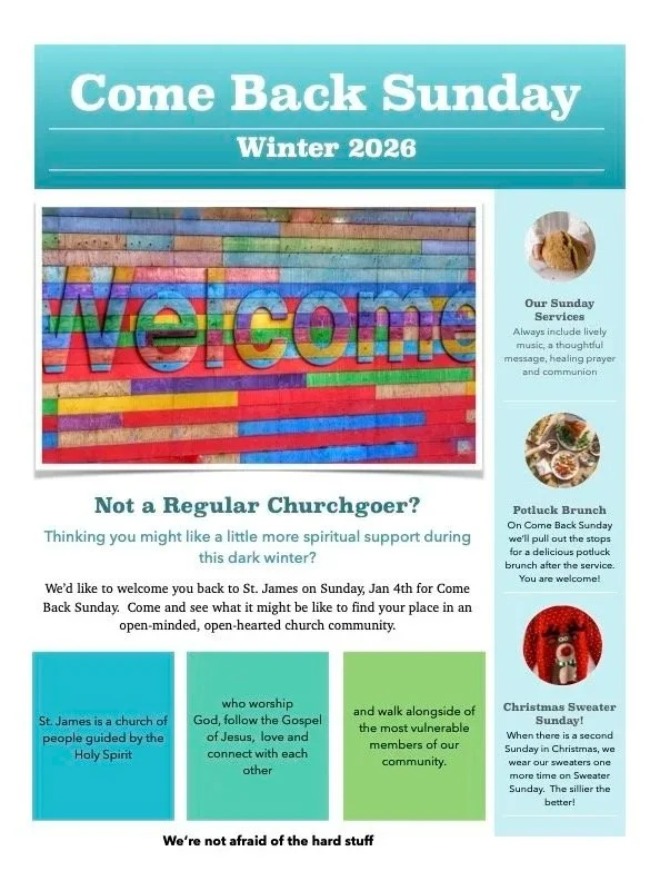 We invited those who visited St. James on Christmas Eve to consider coming back to check out a regular Sunday. Whether you came to Christmas Eve and have decided to come back to stick your toe in, or are just curious about church, you are invited!